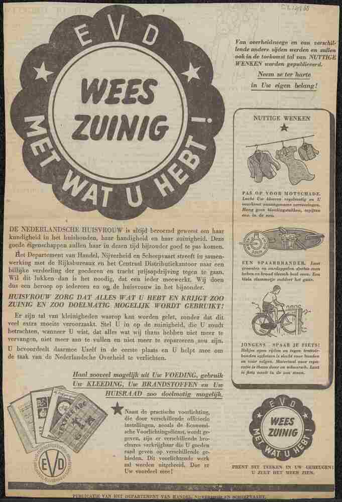 Vel met opgeplakte advertentie: "'E.V.D. Wees zuinig...