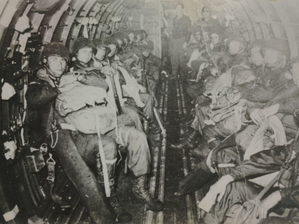 Foto Amerikaanse parachutisten in C-47. Tekst achter...