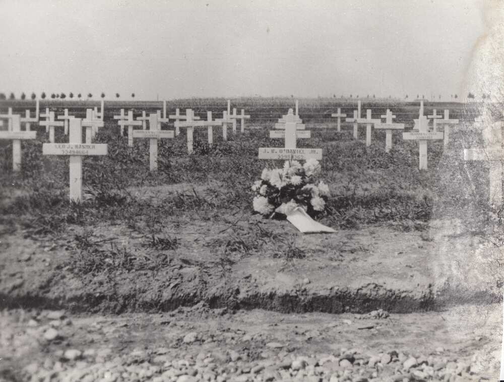 Luchtfoto low oblique van veld met gelande Waco CG-4...