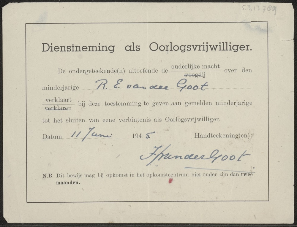 Bewijs van dienstneming als oorlogsvrijwilliger .