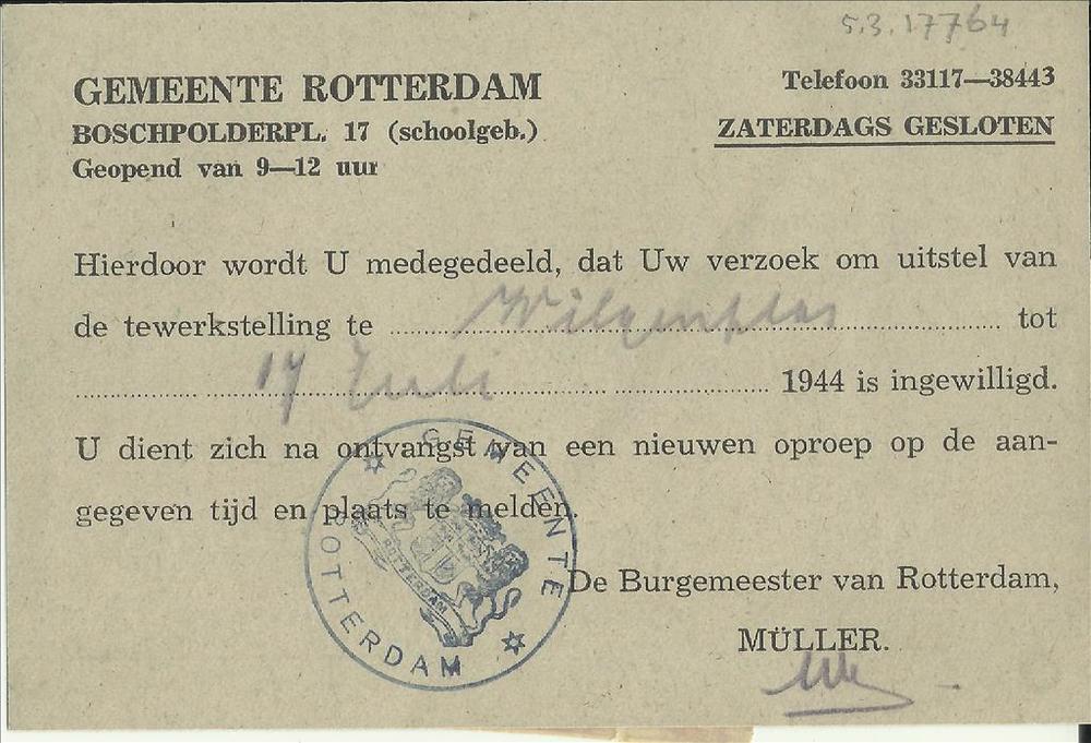 Kaartje van de gemeente Rotterdam aan J.P.A.M. Viest...