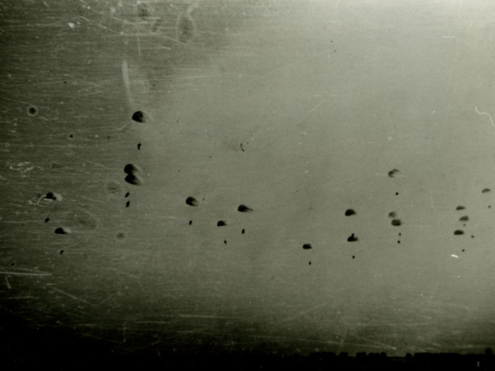 Foto van dalende parachutisten. Tekst achterop: Duit...