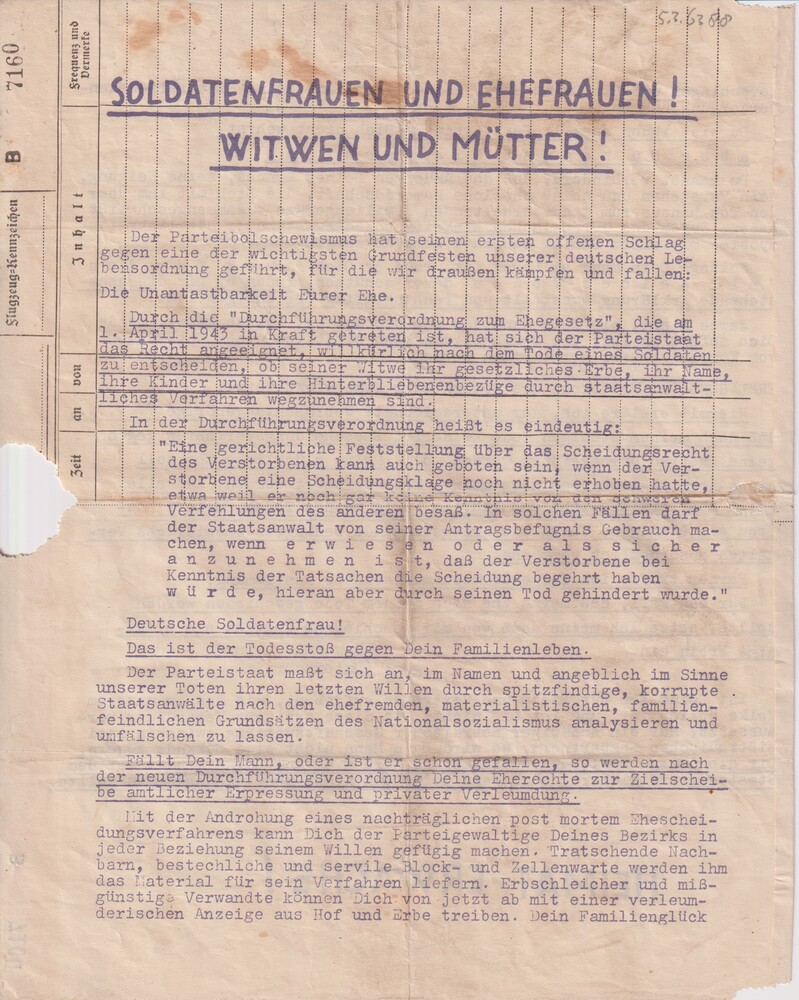 Pamflet: "Soldatenfrauen und Ehefrauen! Witwen und M...