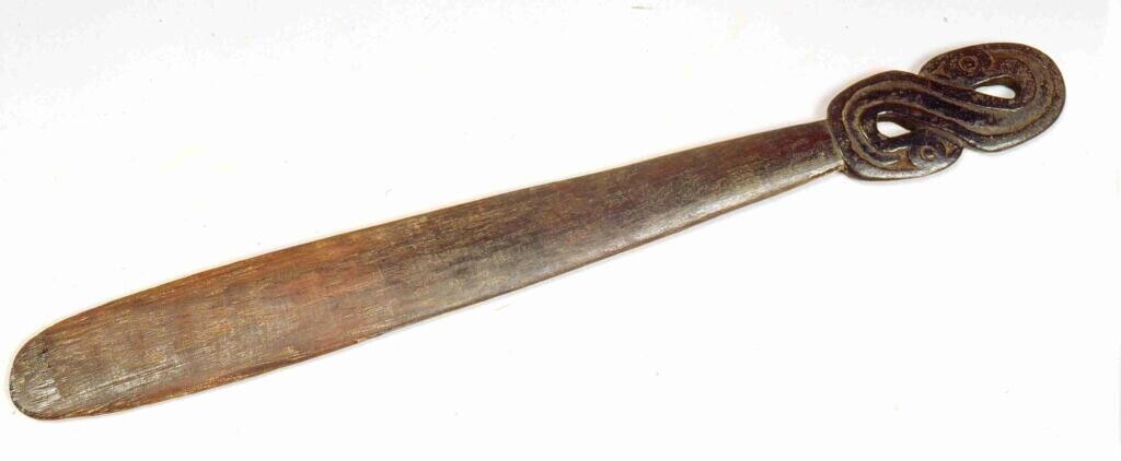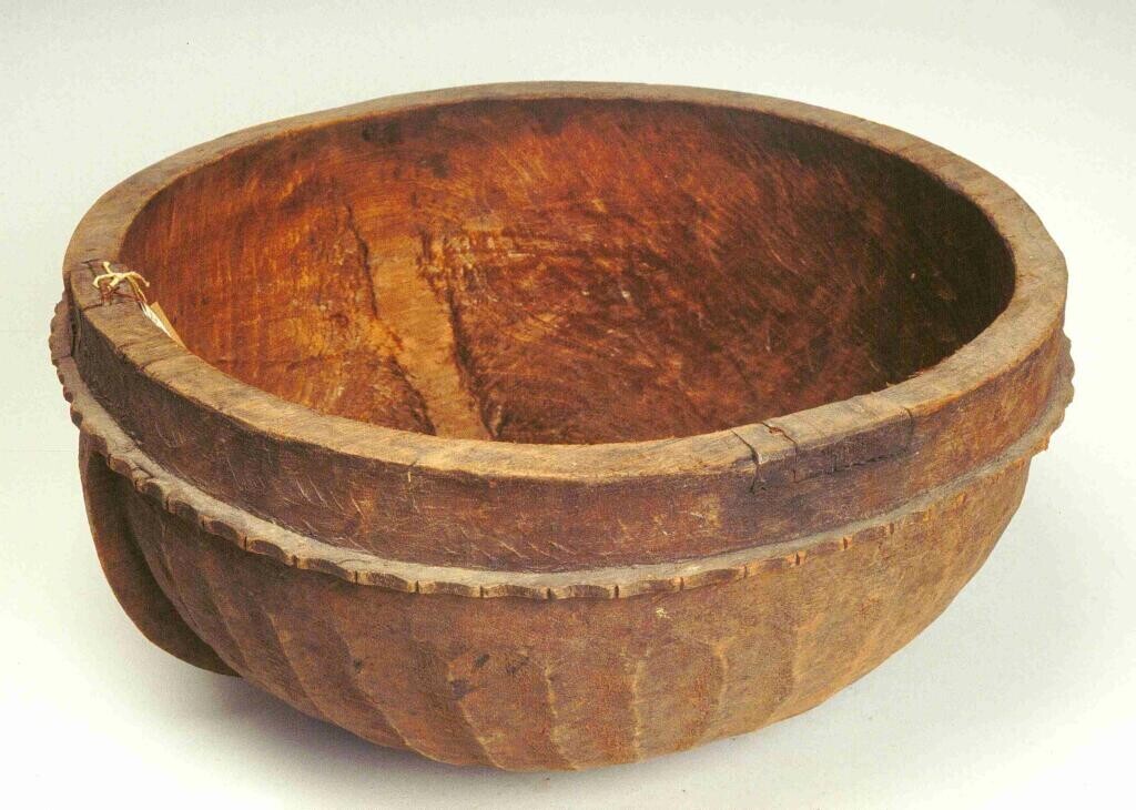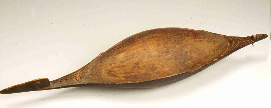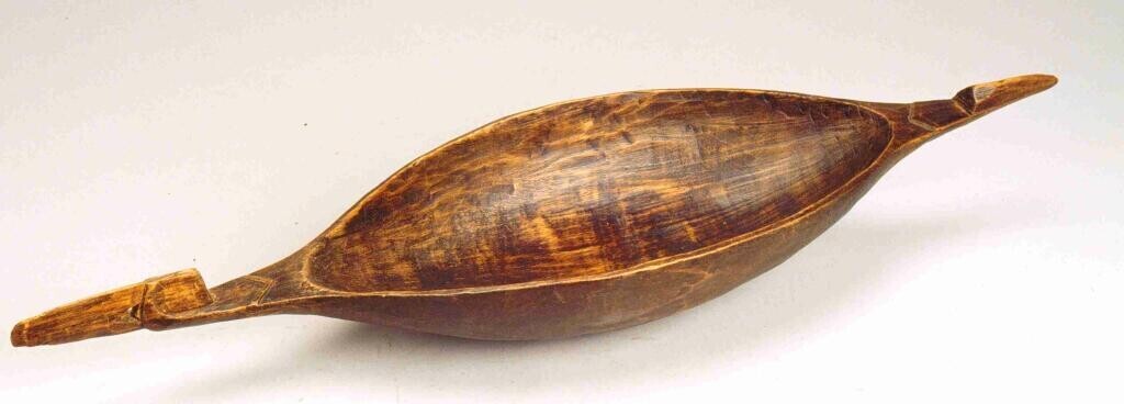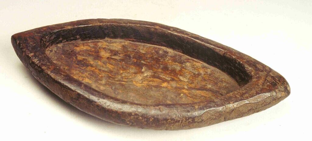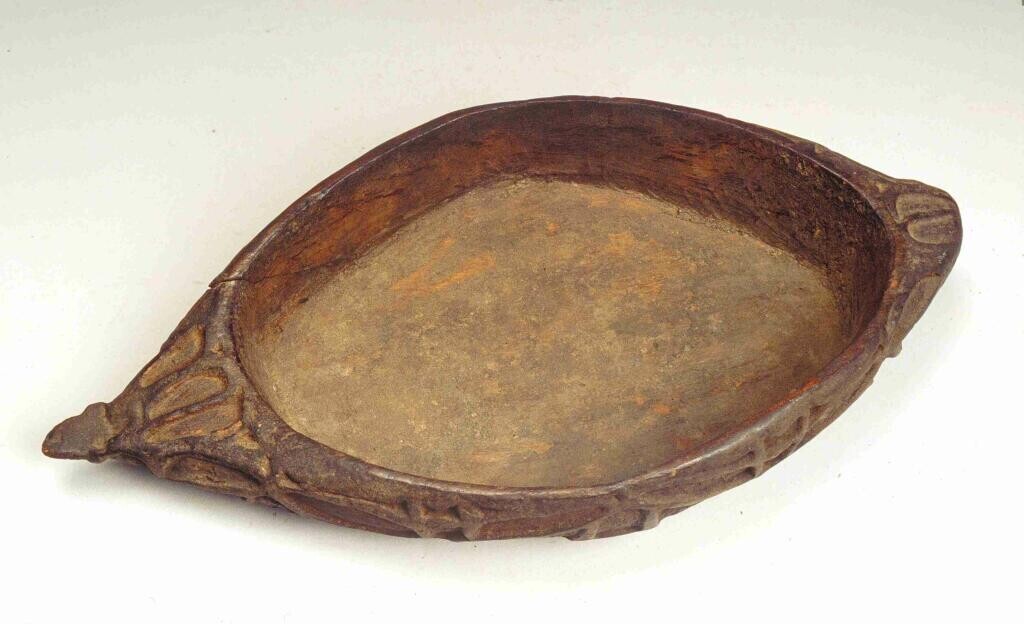 Ovalen, houten voedselbak met bewerkt uiteinde en ge...