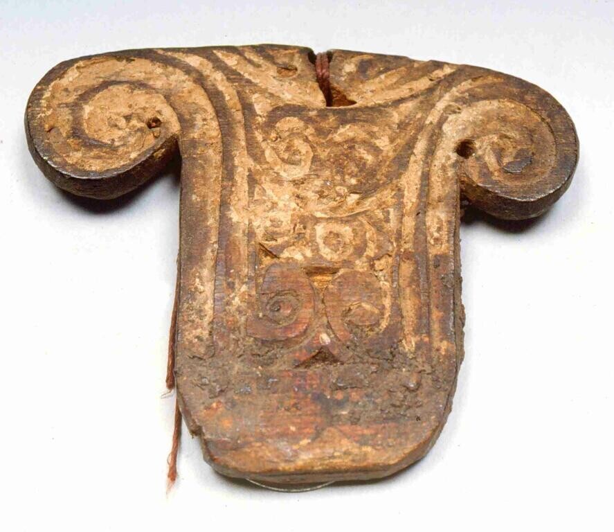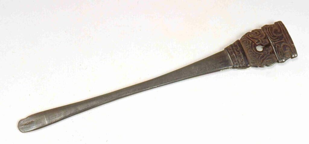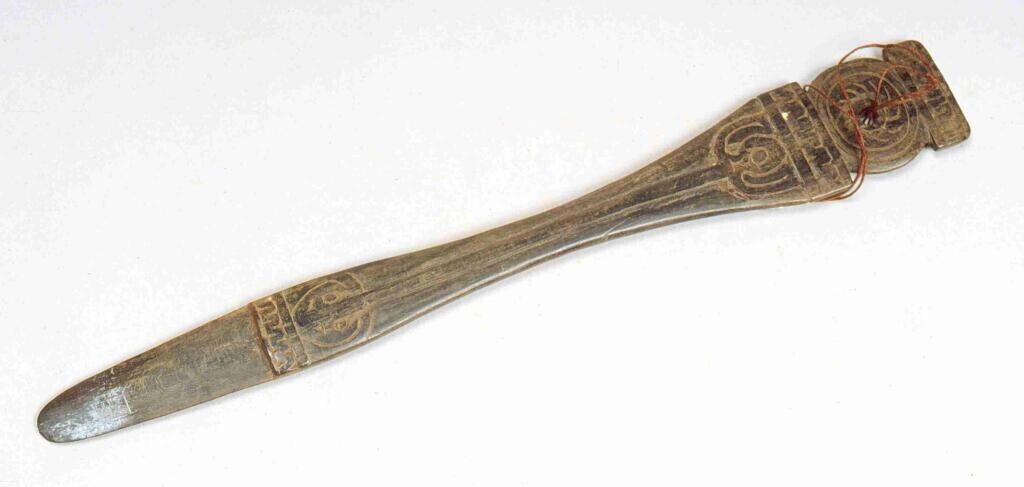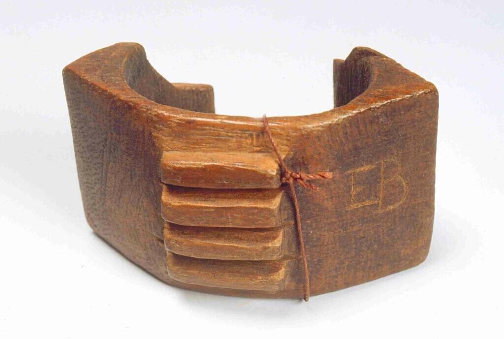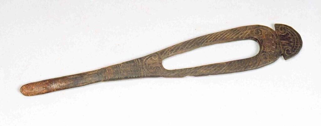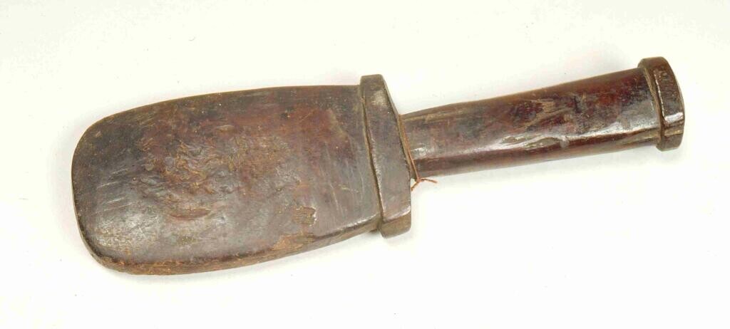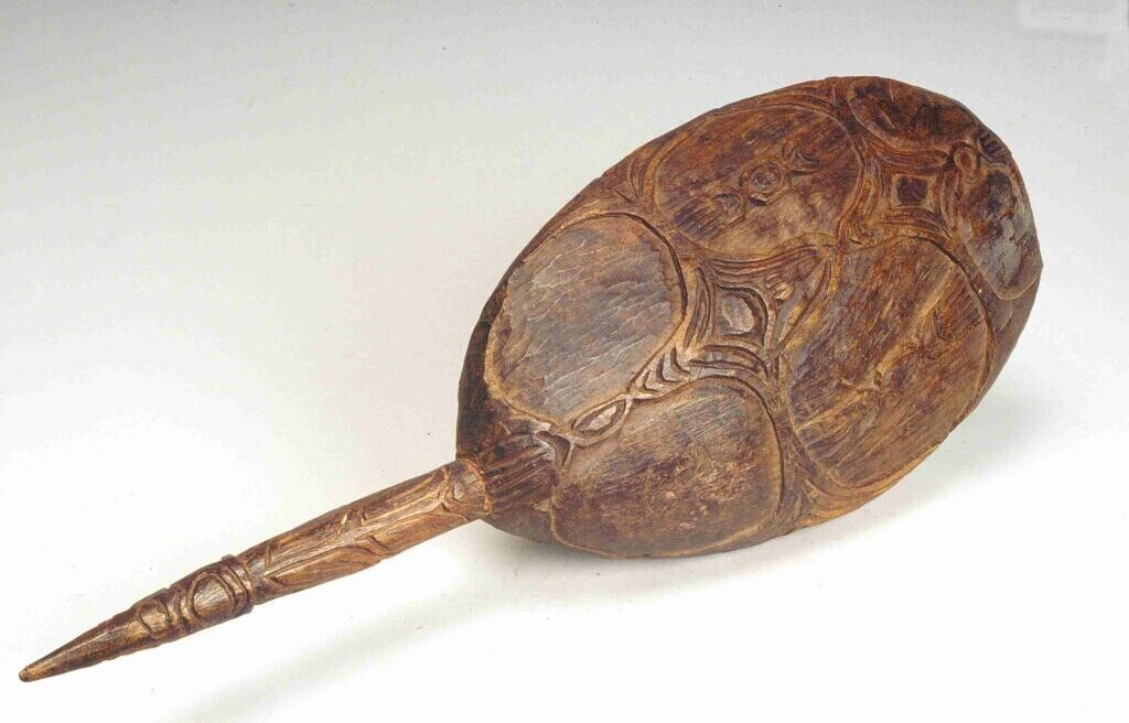 Ovalen, houten voedselbak met lange, bewerkte steel ...