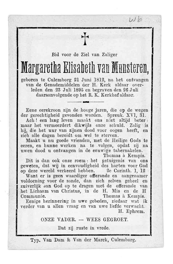 bidprent voor Margaretha Elisabeth van Munsteren. Ge...