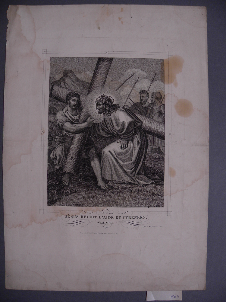 Litho voorstellende vijfde statie uit de kruisiging ...