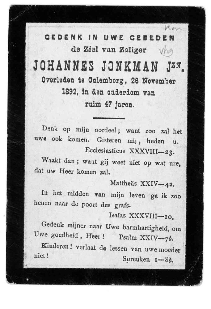 bidprent voor Johannes Jonkman Jzn. Geboren 1845. Ov...