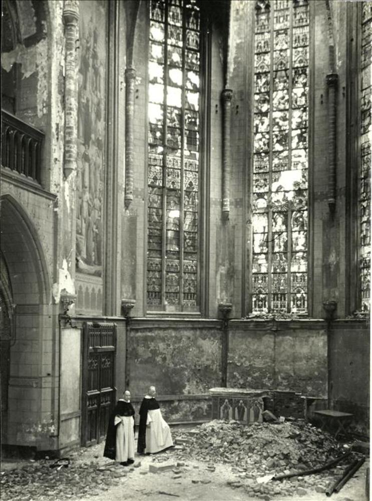 twee geestelijken in interieur verwoeste kerk