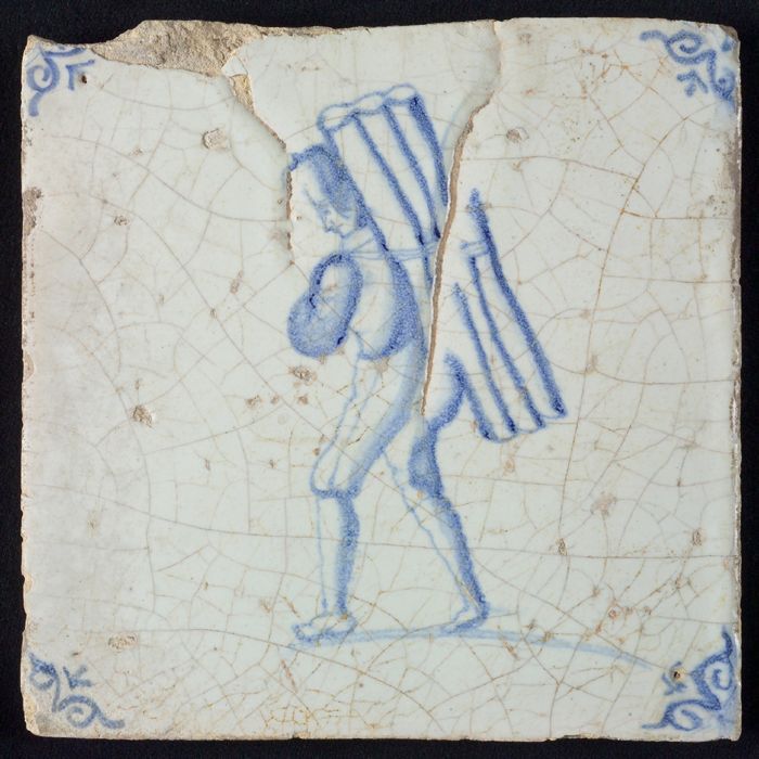Beroepentegel, blauw op wit, man met hout op zijn ru...