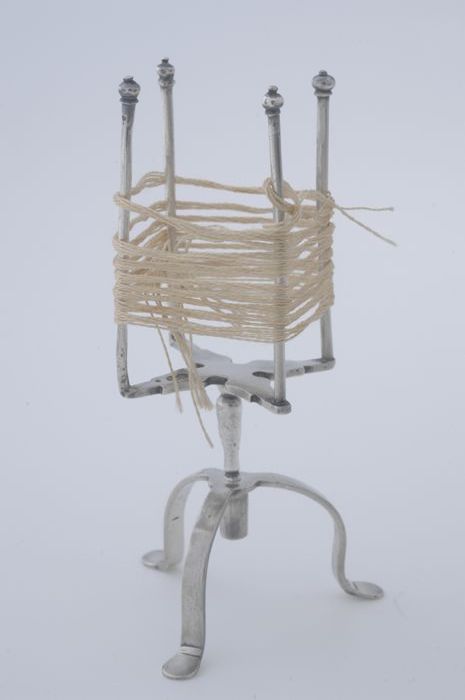 Miniatuur zilveren spoel, omwikkeld met garen
