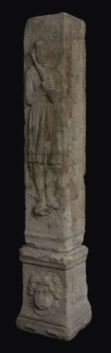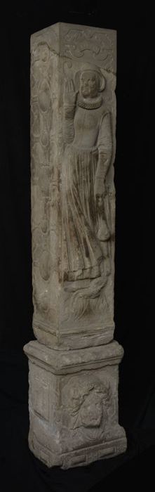 Basement en pilaster van poort vleeshal, man met bijl