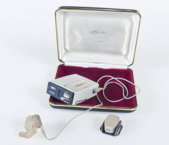 Gehoorapparaat met los onderdeel, in een doosje