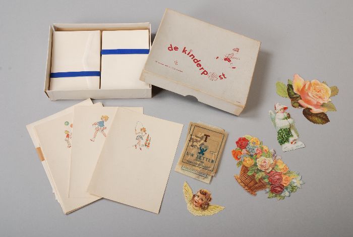 Kinderpostpapier in doos, met drie zakjes letters en...