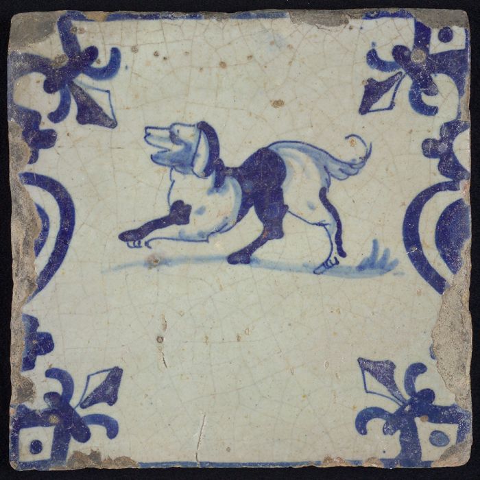 Dierentegel, hond tussen balusters, hoekmotief frans...