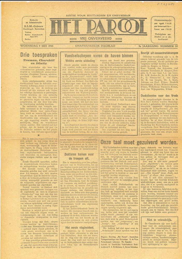 Het Parool - woensdag 9 mei 1945 editie voor Rotterd...