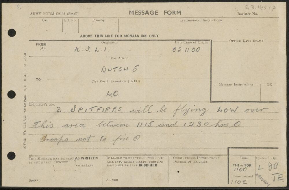 Bericht van K.S.L.I. aan Dutch 5 dat 3 spitfires tus...