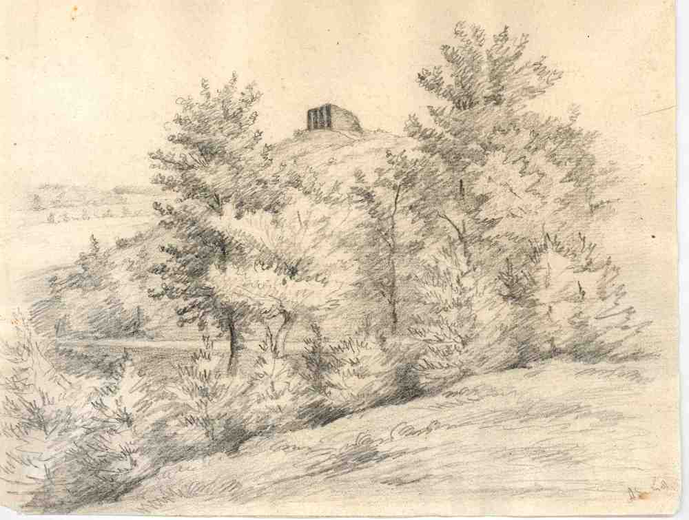 heuveltje met ruïne en bomen