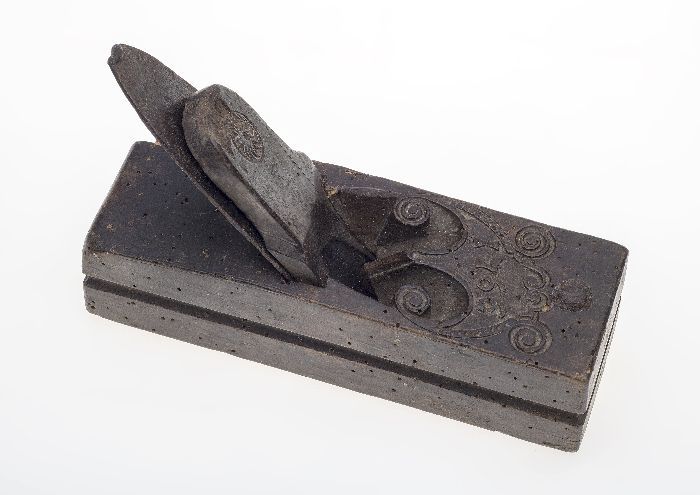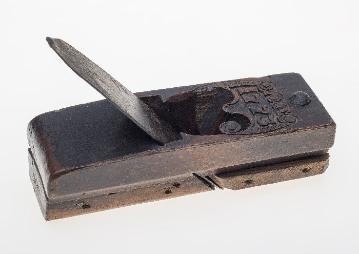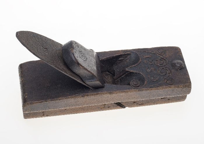 Houten bossingschaaf, met slagkop, decoratie en jaar...
