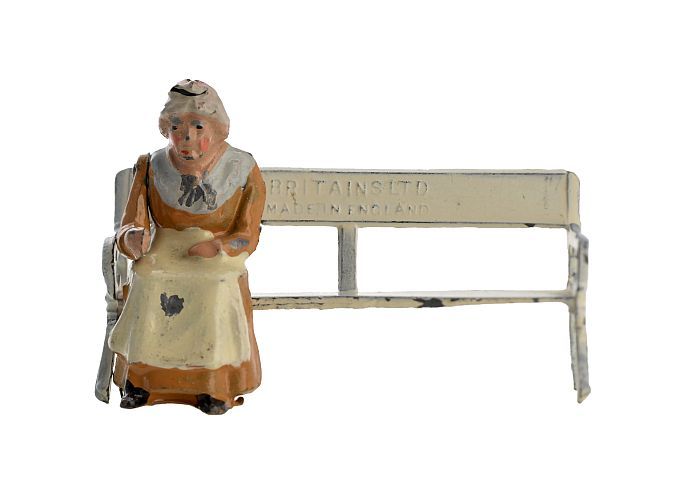 Tinnen figuren in de vorm van een vrouw op een bankje