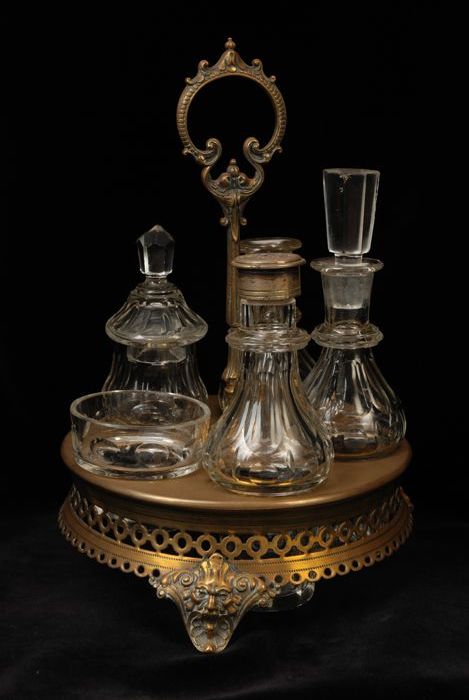 Koperen olie-en-azijn-stel met gefacetteerde glazen ...