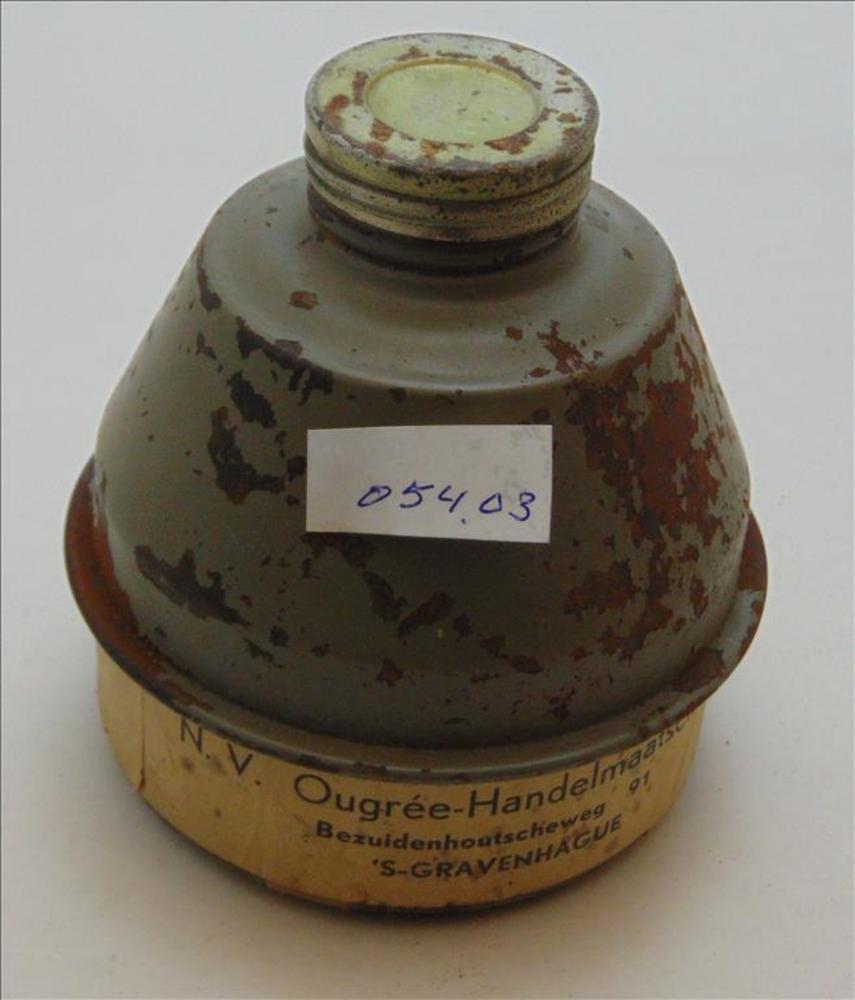 gasfilterbus 1939, met opschrift Phosgeen 3 uur Chlo...