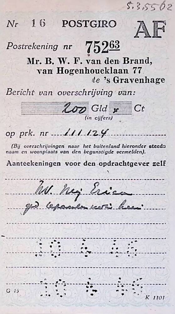Ontvangststrookje storting 200 gld bij B.W.F. van de...