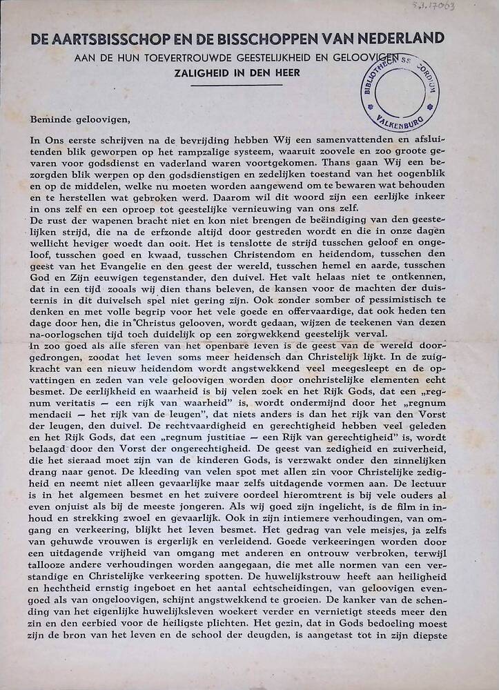 Brief van het Nederlands episcopaat, over zedelijkhe...