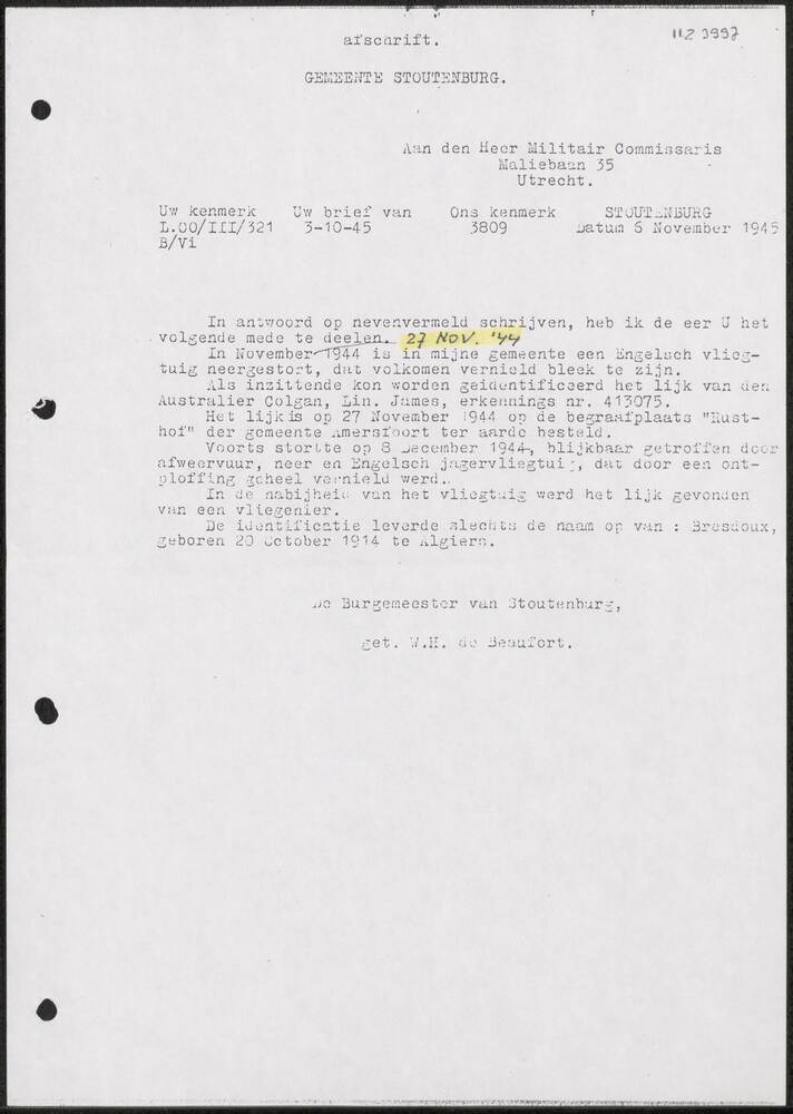 Brief van de burgemeester van Stoutenburg, 6 novembe...