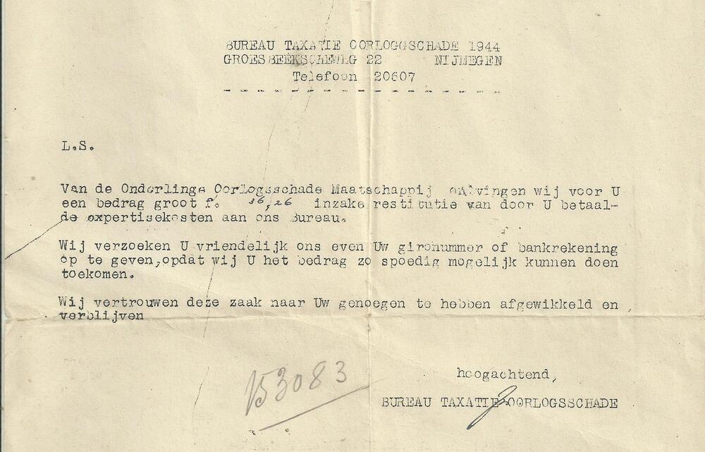 Brief van Bureau Taxatie Oorlogsschade 1944.