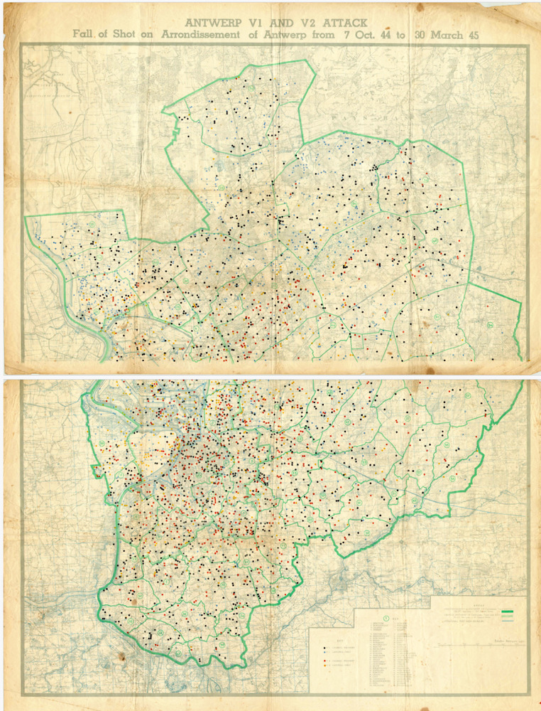Kaart van de V1 en V2 aanvallen op Antwerpen tussen ...