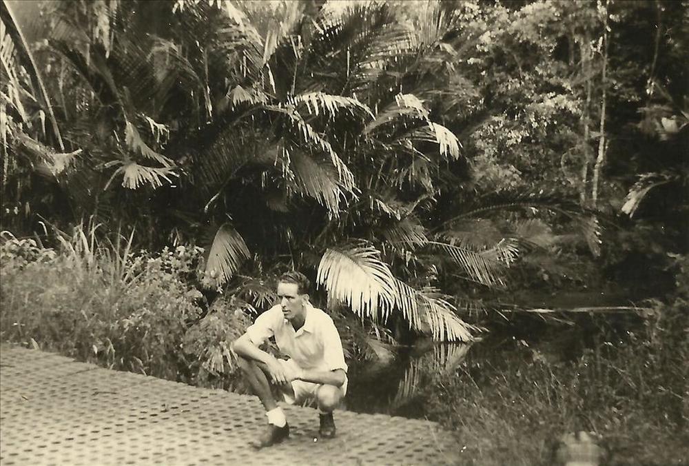 Nieuw-Guinea; KM-militair gehurkt op rijplaten weg
