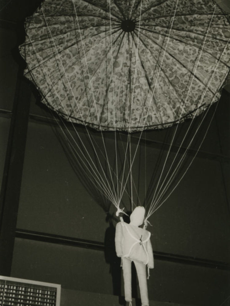 Foto van dummy parachutist in museum. Tekst achterop...