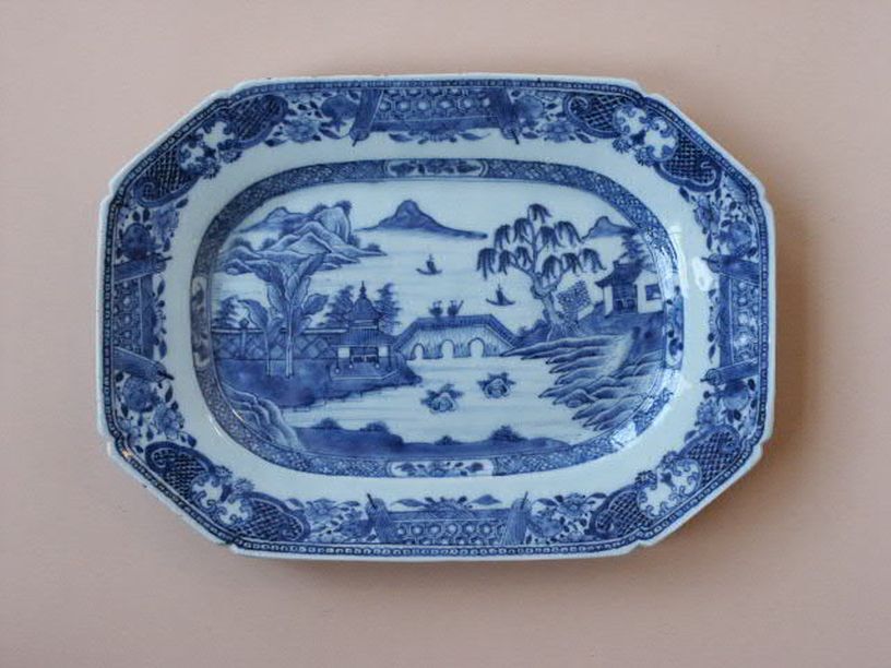 3 schalen, achthoekig, met decor van rivierlandschap