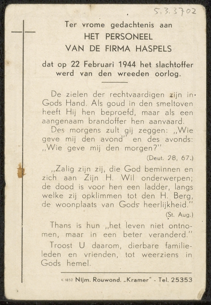 Bombardement Nijmegen; bidprentje personeel Fa. Haspels