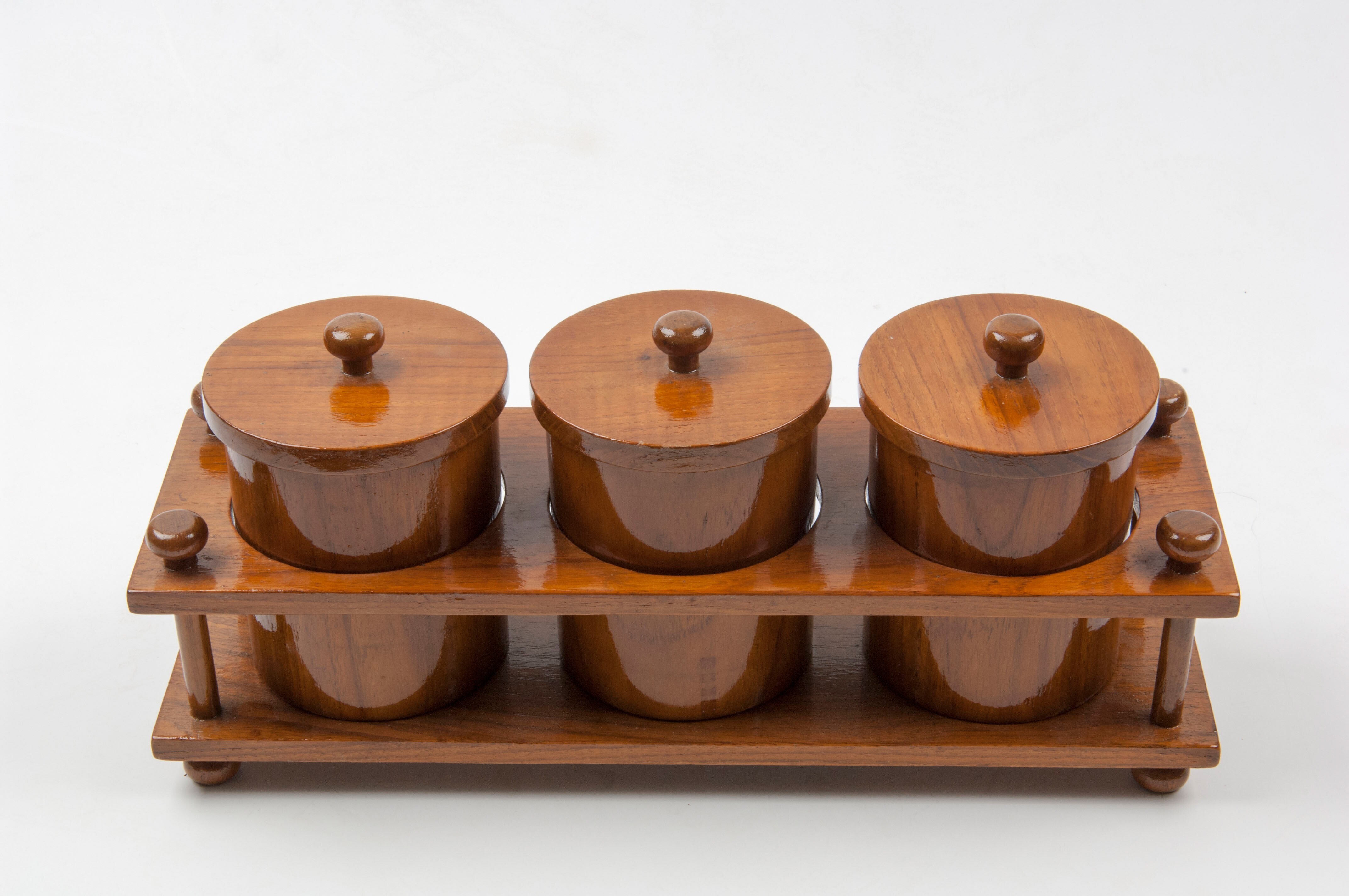 Drie voorraadbussen in houder