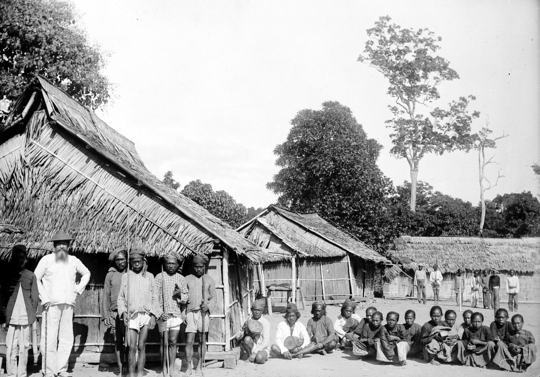 Buru. Woningen en inwoners van Waepote, links staat ...