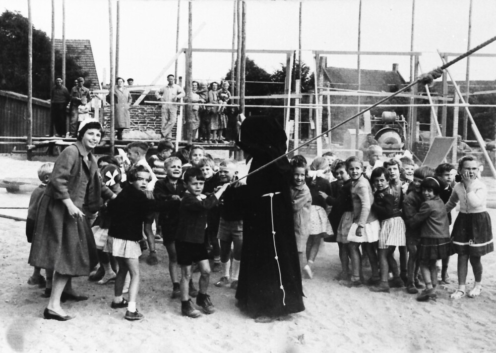 Schoolkinderen en juf bij de bouw van de RK Antonius...
