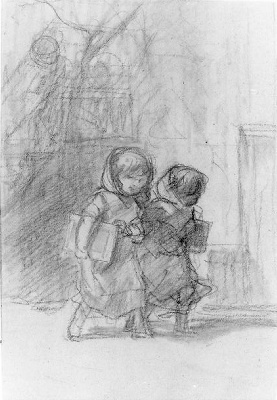 Twee naar rechts lopende meisjes, met schoolleitjes....