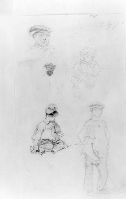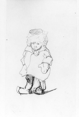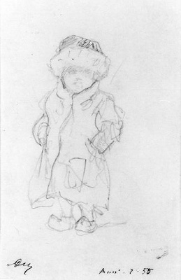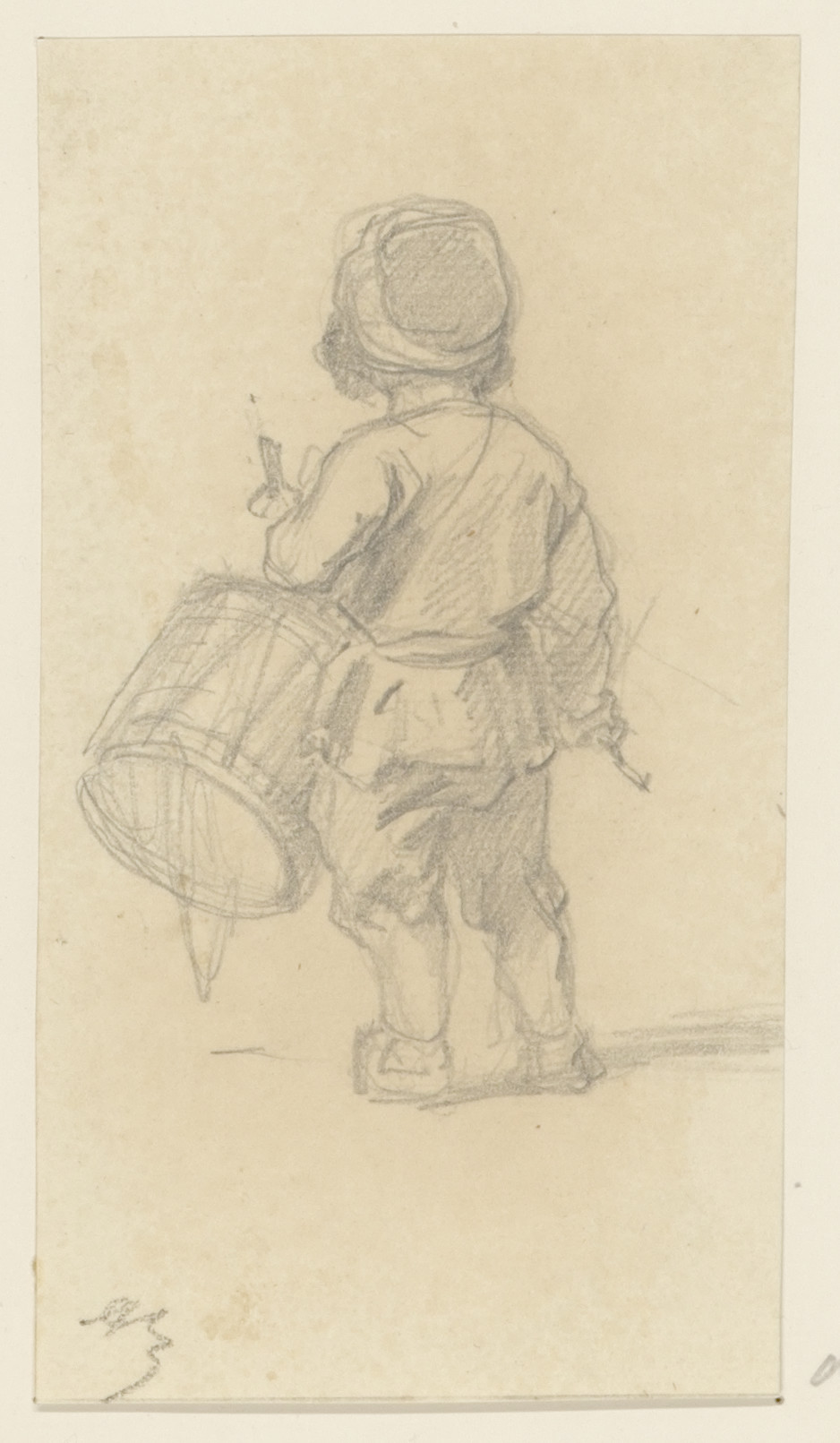 Jongen met jas en muts naar rechts gekeerd, op de gr...