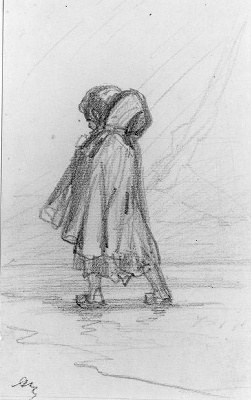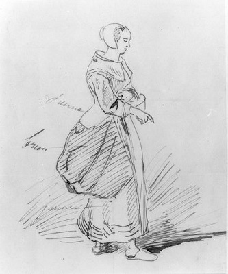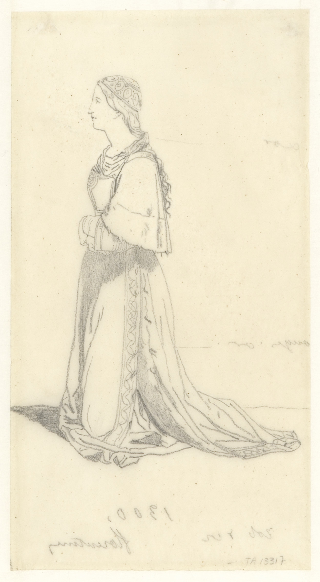 Een naar rechts lopende vrouw, in historisch kostuum...