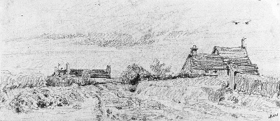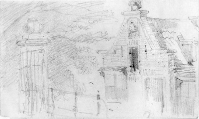 Gedeelte van een huis, links een stenen pilaar en ge...