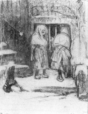 Twee meisjes in de sneeuw voor een raam van een huis...
