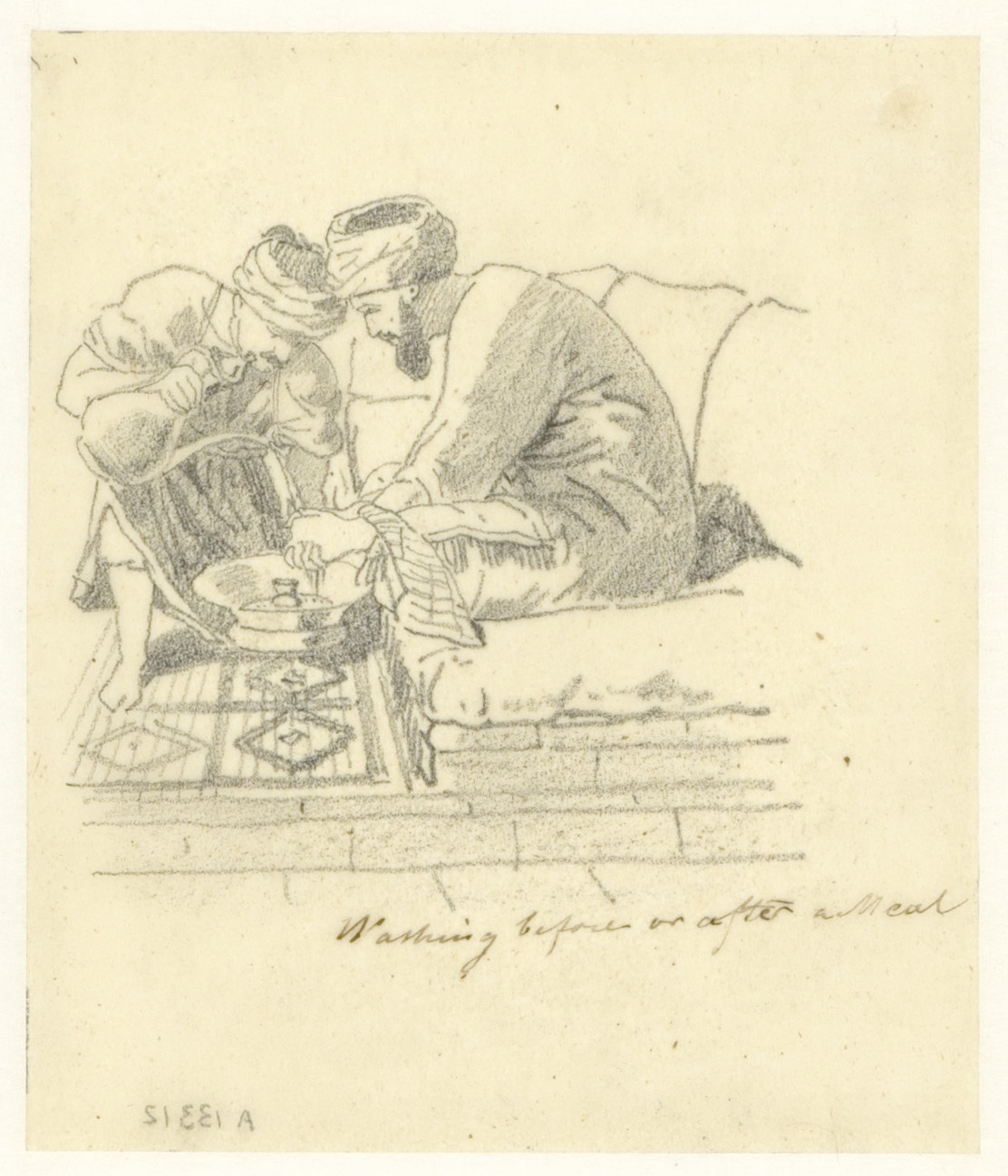 Twee oosterlingen waarvan één zijn handen wast, terw...