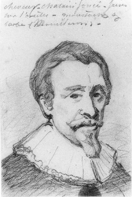 Op een stoel zittende man in 17e eeuws Holl.kostuum ...