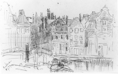 Groep huizen aan een water (waarschijnlijk Amsterdam)