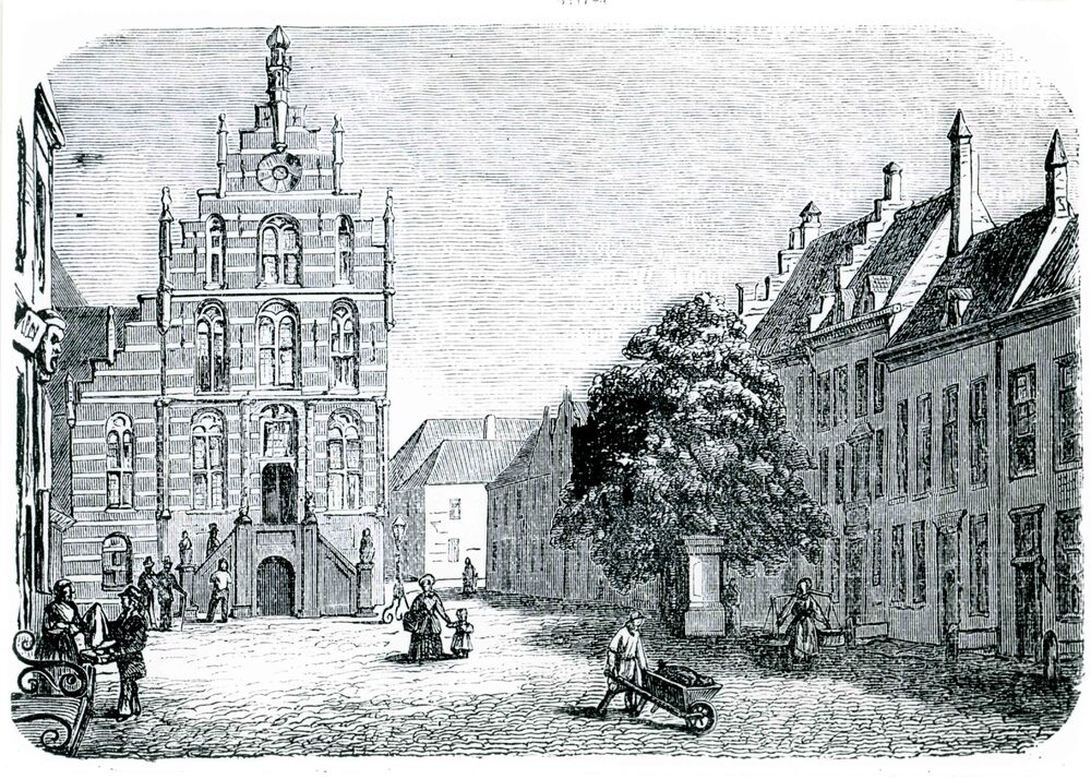 Foto, voorstellende een houtsnede van het stadhuis t...