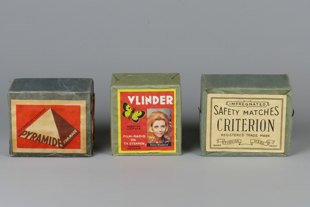 luciferdoosjes met inhoud, in grijs papieren verpakk...