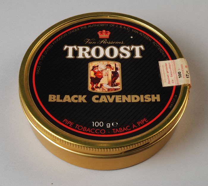 Gesloten zwart en goudkleurig tabaksblik van Van Ros...