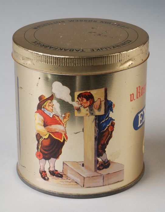 Cilindrisch tabaksblik met los deksel van Van Rossem...